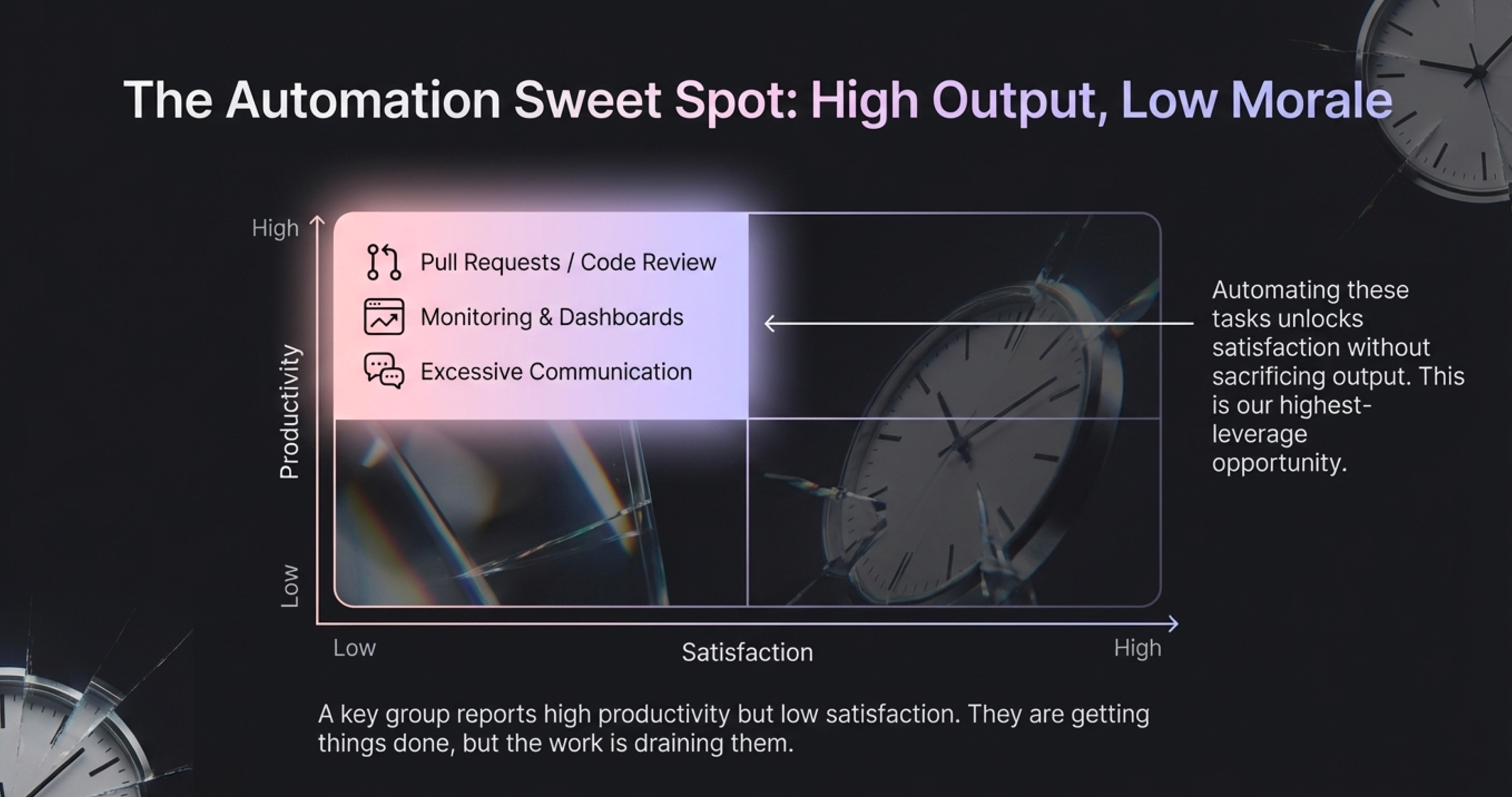 Research on developer work patterns shows productivity drops when developers spend time on tasks they least value—meetings, setup environments, compliance, monitoring dashboard setups, and more. The most effective AI systems reduce cognitive load, not just keystrokes.