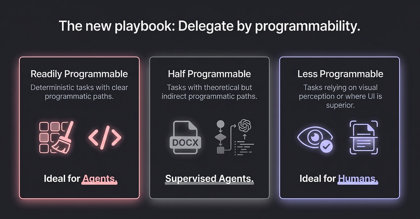 Research comparing human and agent workflows shows that agents operate almost entirely programmatically—through APIs, scripts, and structured commands—bypassing interfaces and visual checks entirely. This makes them fast and cheap, but brittle. When ambiguity or novelty appears, agents rarely pause to question assumptions. Instead, they proceed deterministically, sometimes fabricating missing steps.